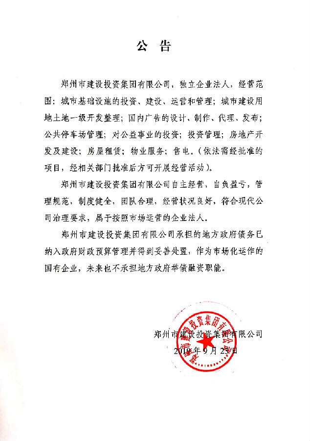 鄭州市建設投資集團有限公司不承擔地方政府舉債融資職能的公告